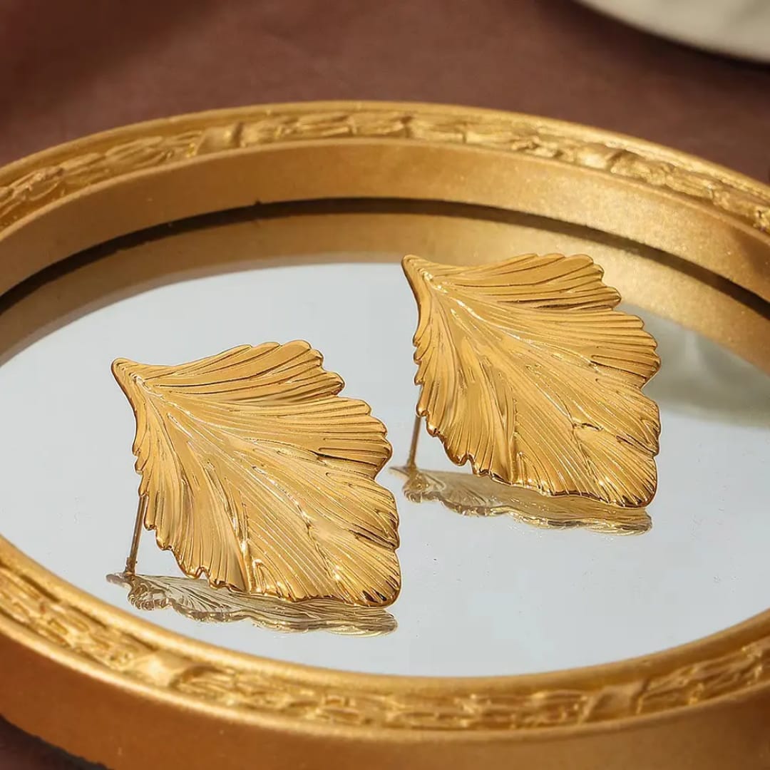 Nature meets artistry in these gold-toned earrings, sculpted to mirror the delicate beauty of fallen leaves. Each piece features intricate vein-like detailing that flows organically from base to tip, creating a sense of movement and texture. The polished finish adds a luminous touch, catching light with every turn and enhancing the earrings’ sculptural silhouette.