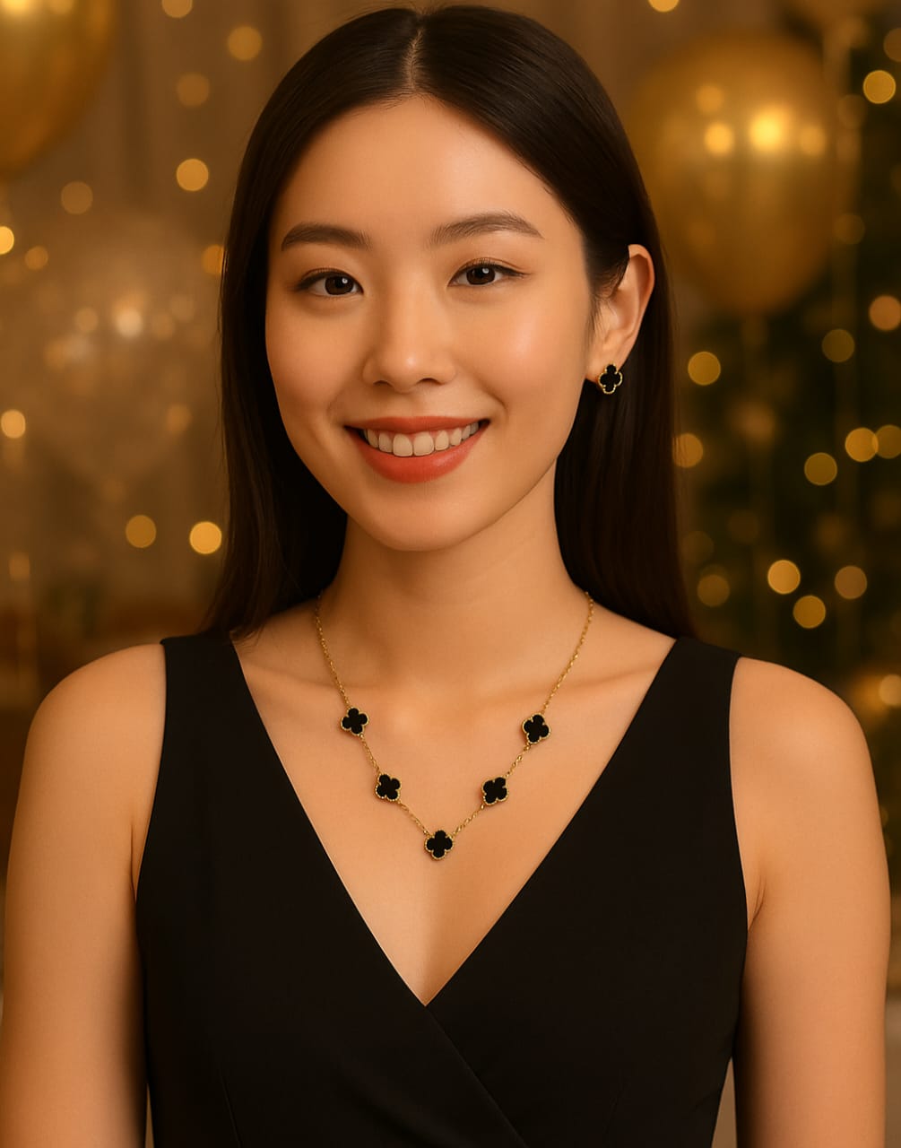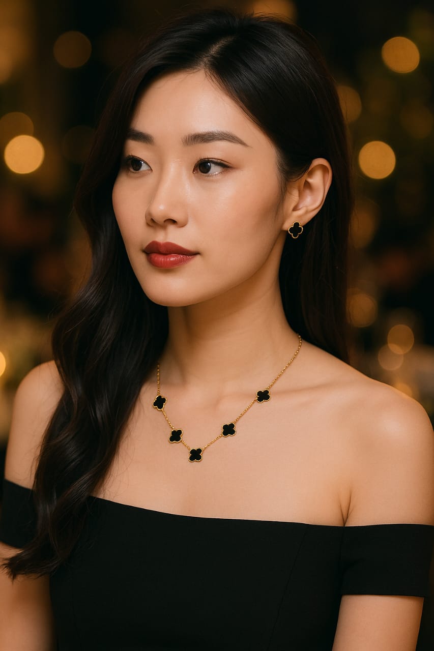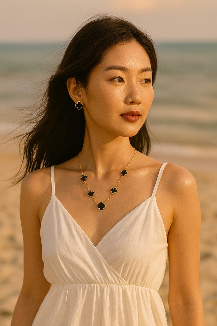 Elevate your elegance with this clover jewelry set, where polished black onyx meets gleaming gold to create a timeless look. The simple clover motifs, displayed as a delicate pendant necklace and matching earrings, offer a touch of modern romance and quiet sophistication. Perfect for evening affairs or elevated resort styling, this set speaks in subtle statements.
