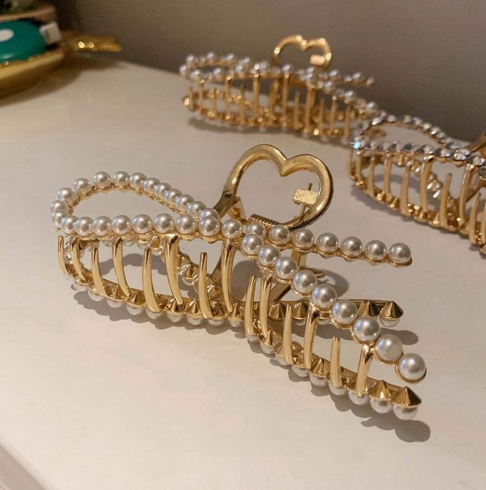 Elevate your updo with this graceful pearl bow hair clip, where classic femininity meets modern sophistication. Crafted with lustrous faux pearls and a delicate gold heart accent, this claw-style clip secures your hairstyle with both beauty and strength. Whether you're styling for a brunch date or a candlelit evening, it adds a polished finish that feels effortlessly refined.