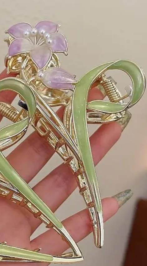 Elevate your hairstyle with these ornamental hair clips, each delicately crafted to capture the charm of springtime blooms. Featuring pastel-toned flowers in soft pink, lavender, and buttery yellow, these clips are accented with pearl-like centers and glossy green leaves that curve gracefully into the gold-toned base.