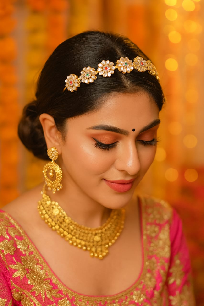 A radiant ode to artisanal beauty, this gold-toned headband blossoms with floral motifs, each petal delicately sculpted in white enamel and crowned with a vivid gemstone—emerald green, ruby red, and sapphire blue. The semi-circular silhouette hugs the wrist with graceful ease, while the alternating colors lend a playful yet regal rhythm to the design. Perfect for festive occasions, bridal styling, or statement layering, this piece brings together tradition and modernity in a single, luminous gesture.