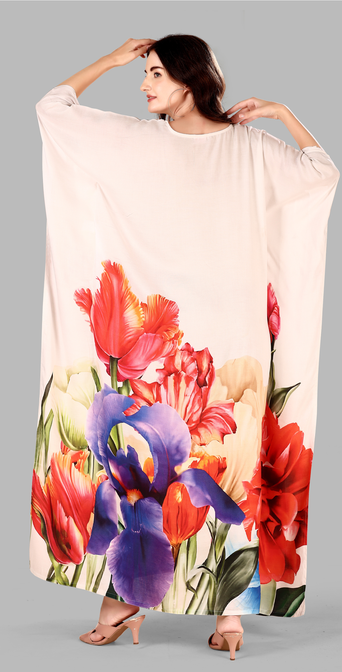 Make a sweeping statement with the Bold Blossom Kaftan—a floor-length silhouette that transforms floral artistry into wearable elegance. Set against a soft cream canvas, the lower half blooms with vivid irises, tulips, and poppies in rich shades of red, purple, orange, and green, creating a painterly garden that moves with you.
