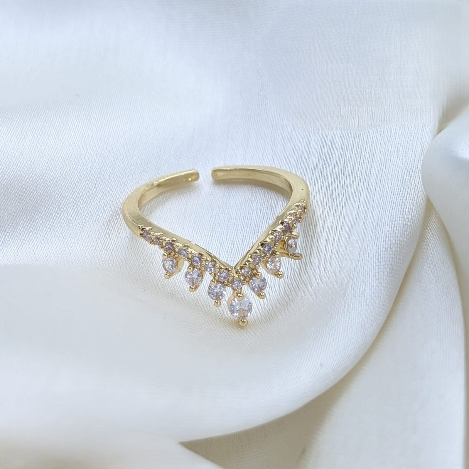 Grace meets shimmer in this ethereal V-shaped gold ring, adorned with a cascade of pear-cut stones that dance with every movement. The open design hugs the finger with a gentle curve, while the dangling accents add a touch of whimsy and brilliance. Perfect for layering or wearing solo, this piece brings a modern twist to timeless sparkle.