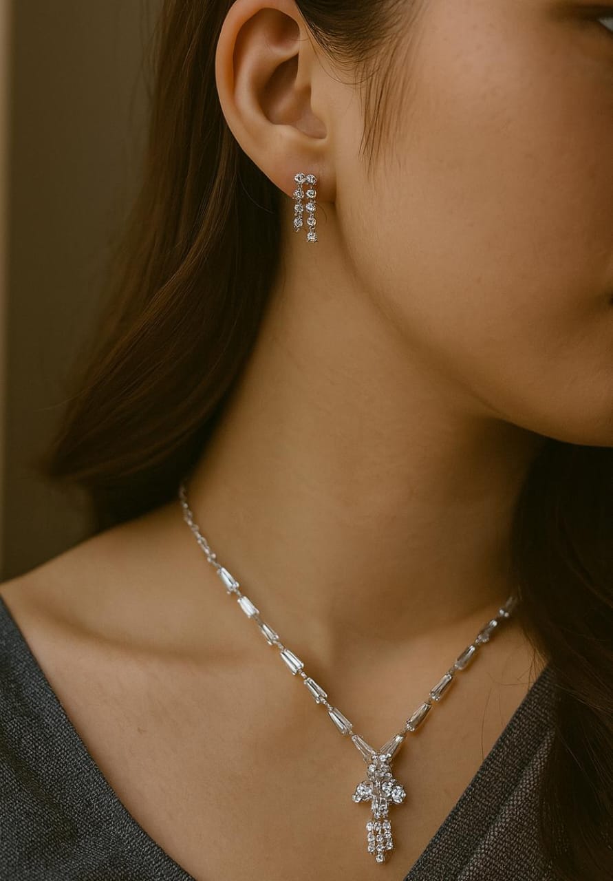 Pastel Bloom Statement Set A celebration of soft hues and intricate design, this jewelry set features a floral-inspired necklace and coordinating drop earrings that blend pastel charm with regal sophistication. The necklace showcases blush pink and mint green stones arranged in a symmetrical bloom, accented by clear rectangular crystals along the chain and delicate bead-like drops that add graceful movement. Paired with cascading earrings of luminous round stones, the ensemble offers a cohesive look that’s both romantic and refined. Perfect for festive occasions, resort evenings, or editorial styling, this set brings a touch of garden elegance to any wardrobe.