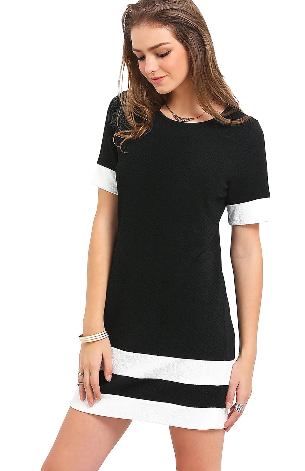 A short black dress, clean-cut and modern, is elevated by crisp white accents that frame the sleeves and hem with graphic precision. A thick white stripe near the bottom adds visual weight and a touch of sporty sophistication, making the silhouette feel structured yet playful. The dress skims the body with effortless grace—ideal for both casual outings and semi-formal affairs. Paired with black high-heeled sandals featuring crisscross straps, the ensemble exudes confidence and sleek femininity. It’s a look that speaks in contrasts: bold yet refined, simple yet striking.